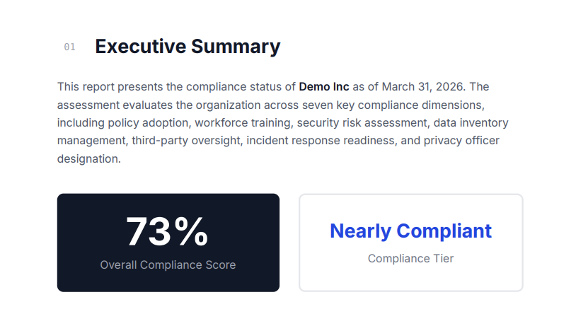 Full compliance visibility Reports include everything in one place — policies, training, risk assessments, incidents, third-party risk, and data inventory — making audits and reviews much easier.