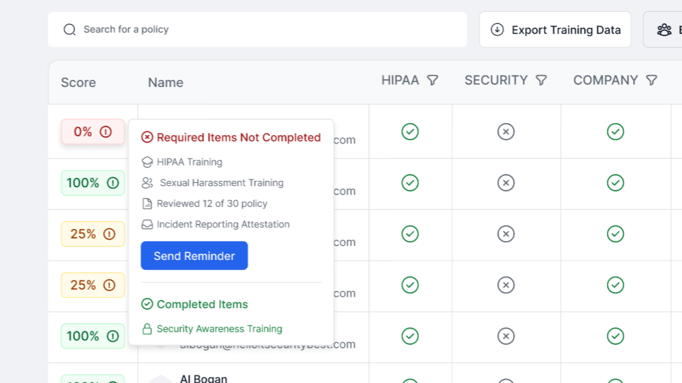 You can now view each team member’s Compliance Progress — a percentage-based indicator showing how far they’ve come in meeting their compliance requirements.