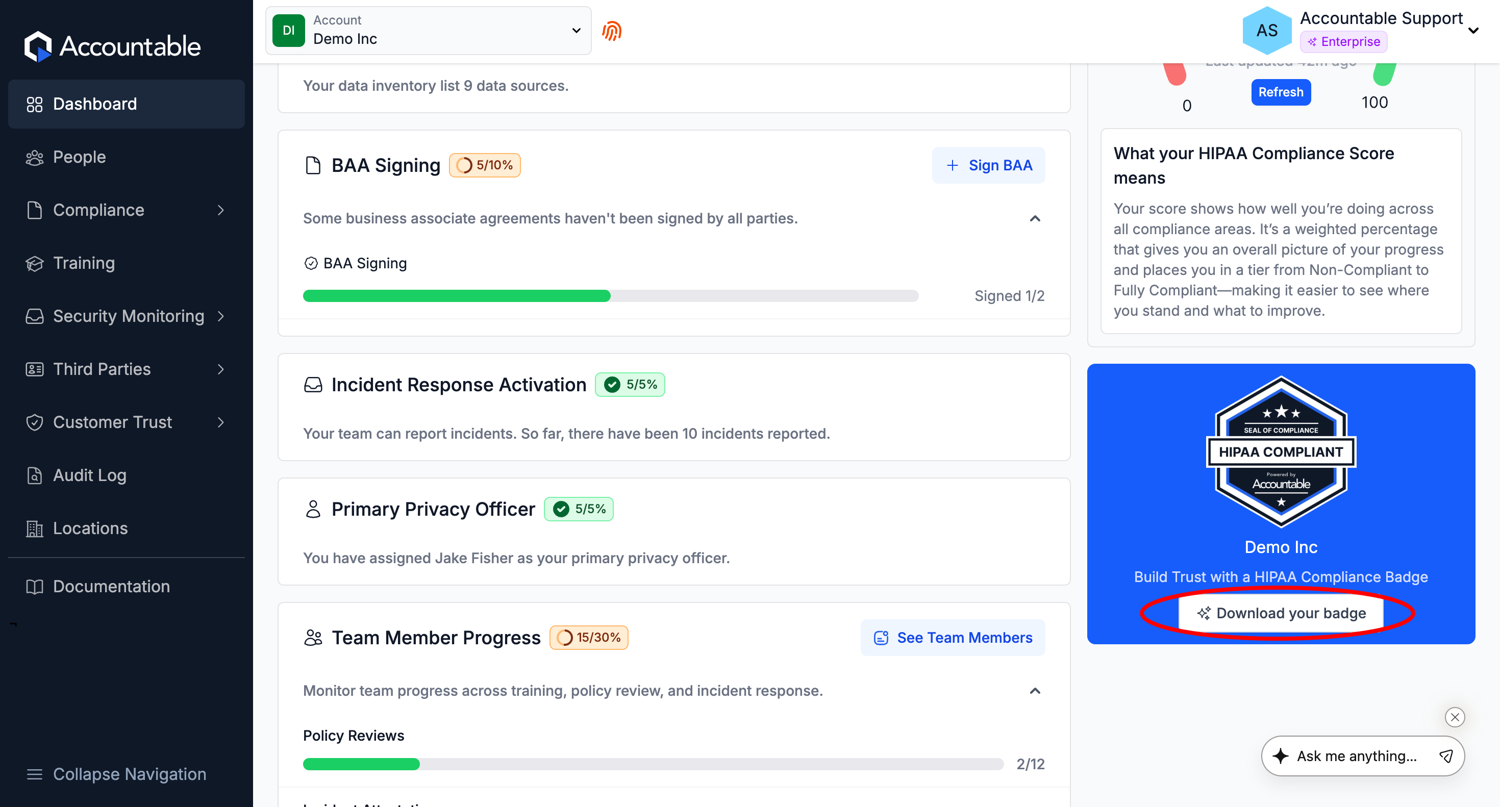 Once your organization reaches a 90% Compliance Score, you achieve access to your HIPAA Seal of Compliance Badge.
