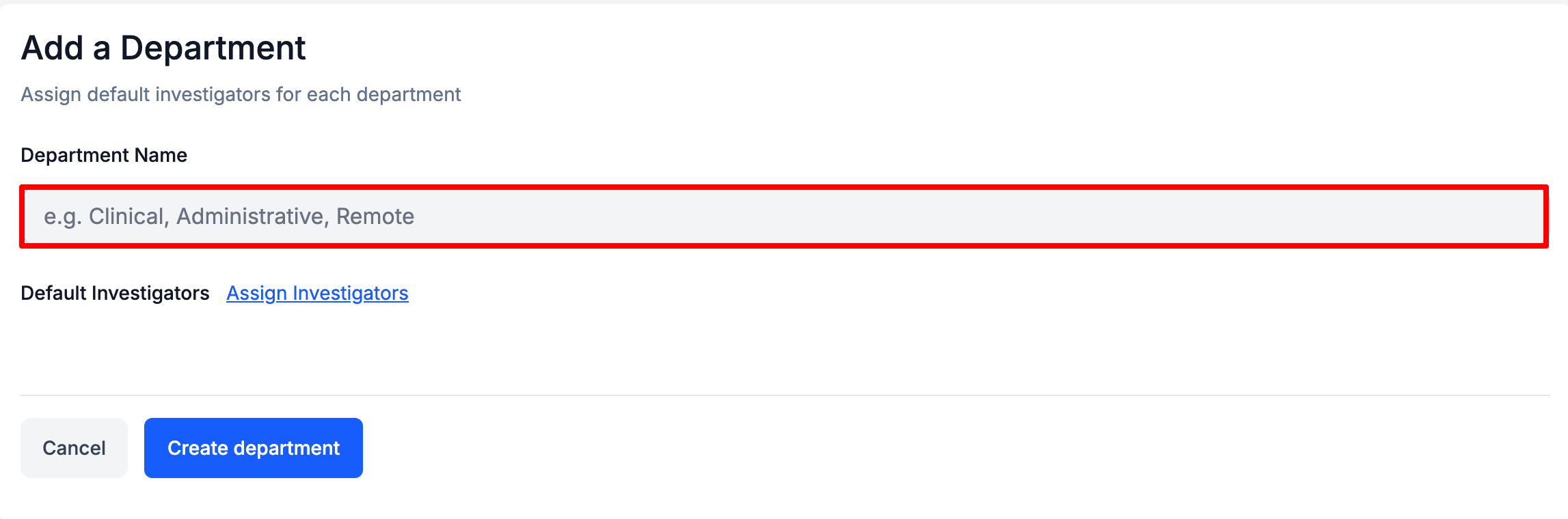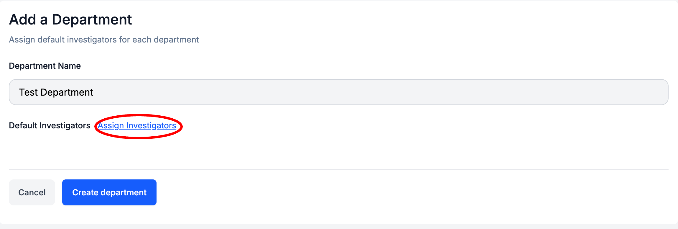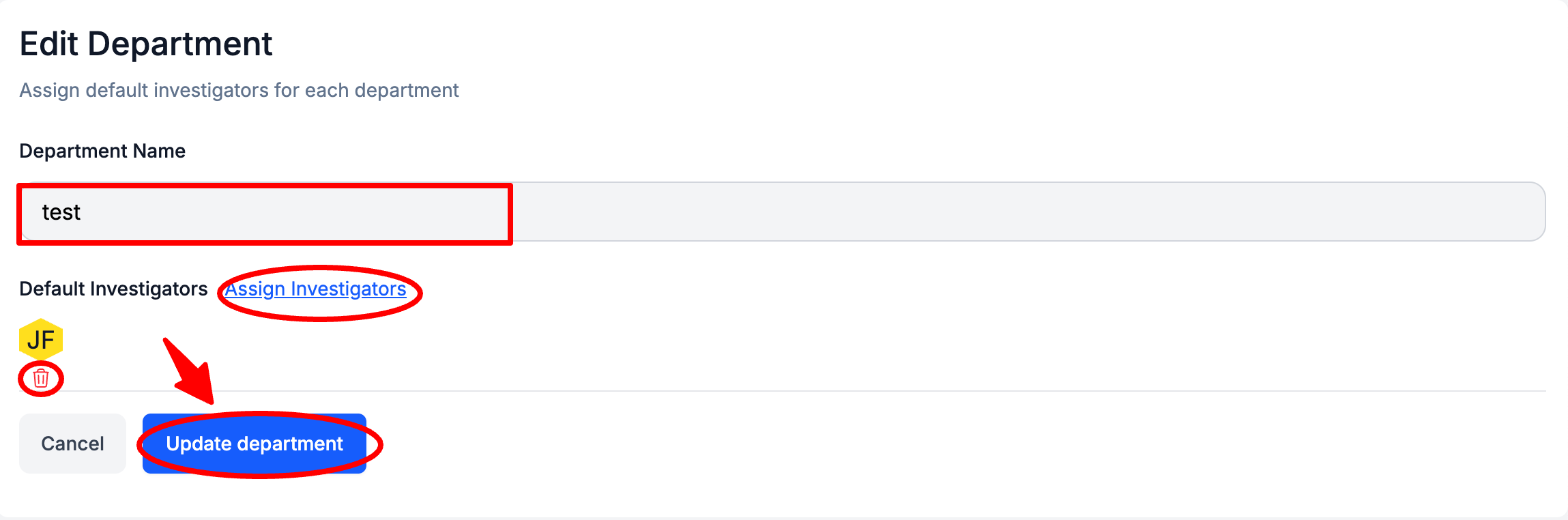 Optionally, Edit the Department Name, Assign additional Default Investigators, and/or Delete Default Investigators > Select Update Department