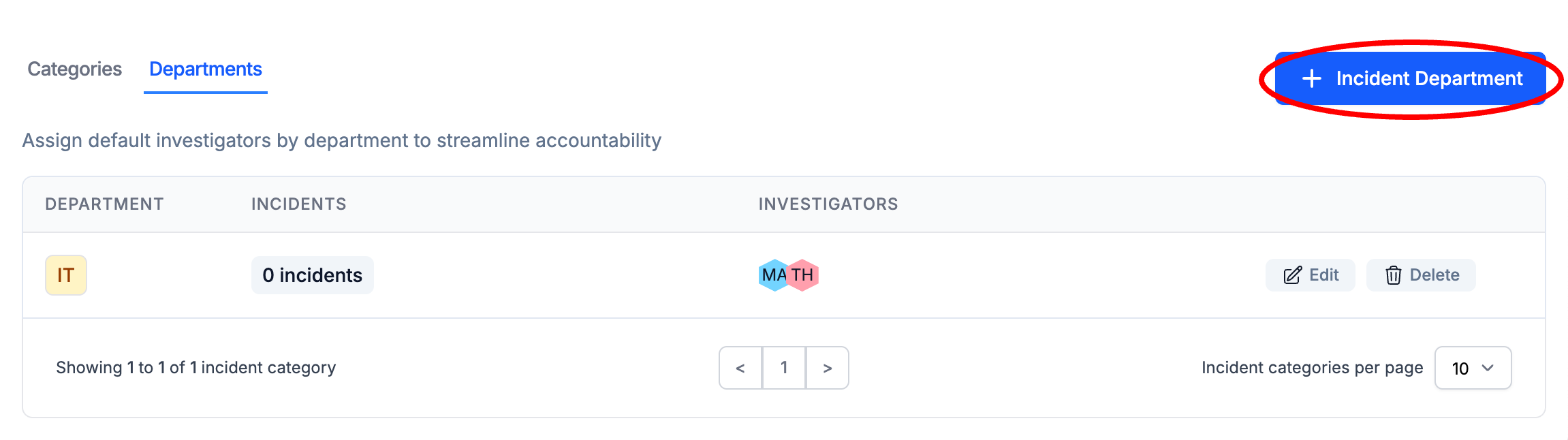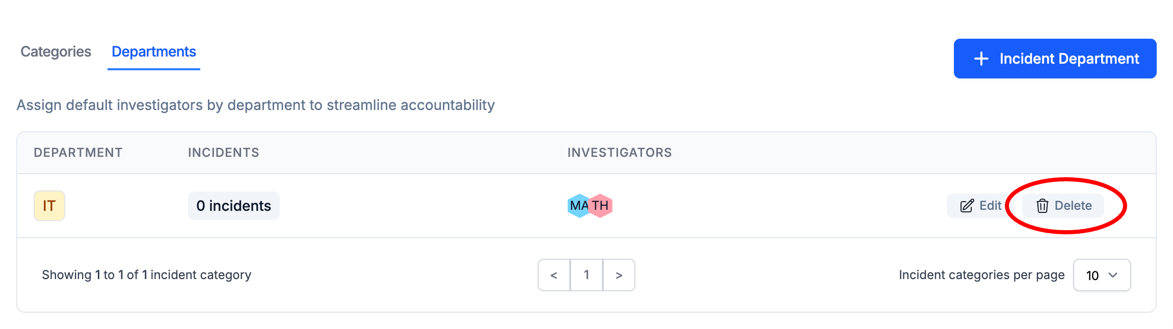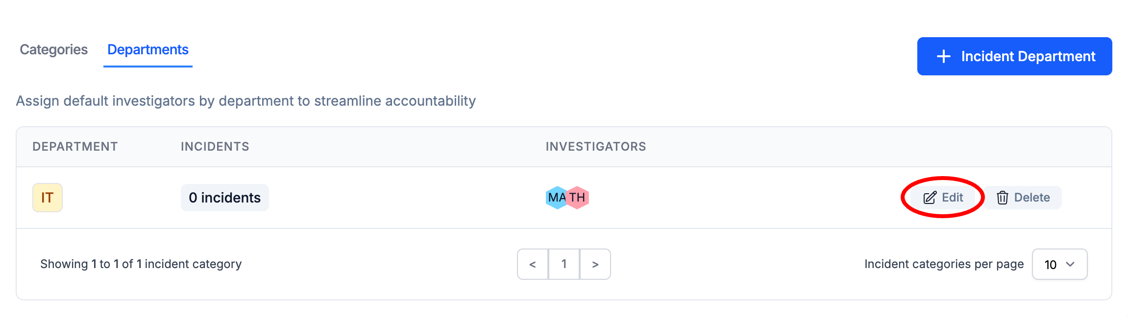 Optionally, Edit the Department Name, Assign additional Default Investigators, and/or Delete Default Investigators > Select Update Department