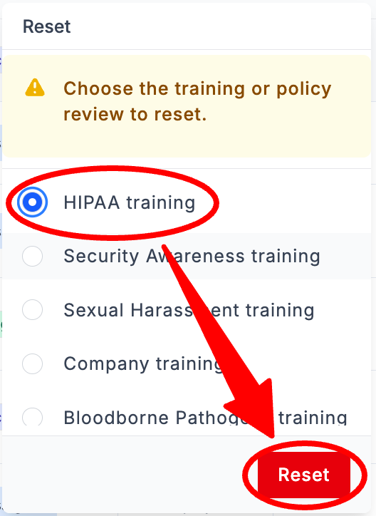 Select the Training Course or Policy Review to Reset > Select Reset