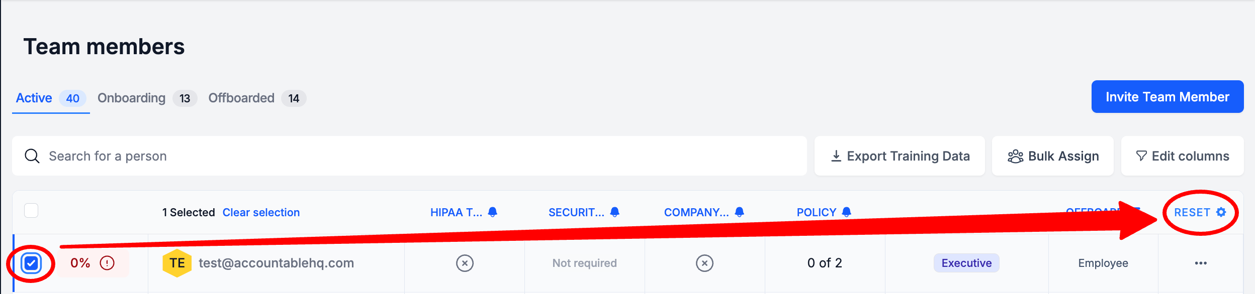 In the Team Members table, Select the checkbox next to a Team Member(s) > Select Reset above the Actions Column