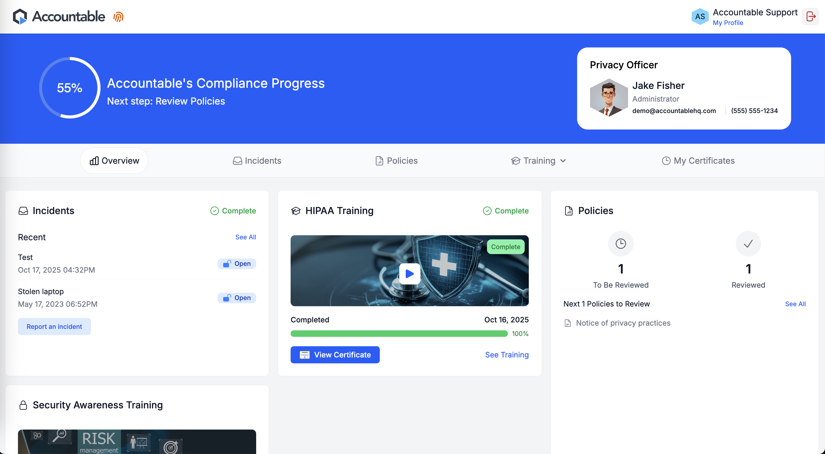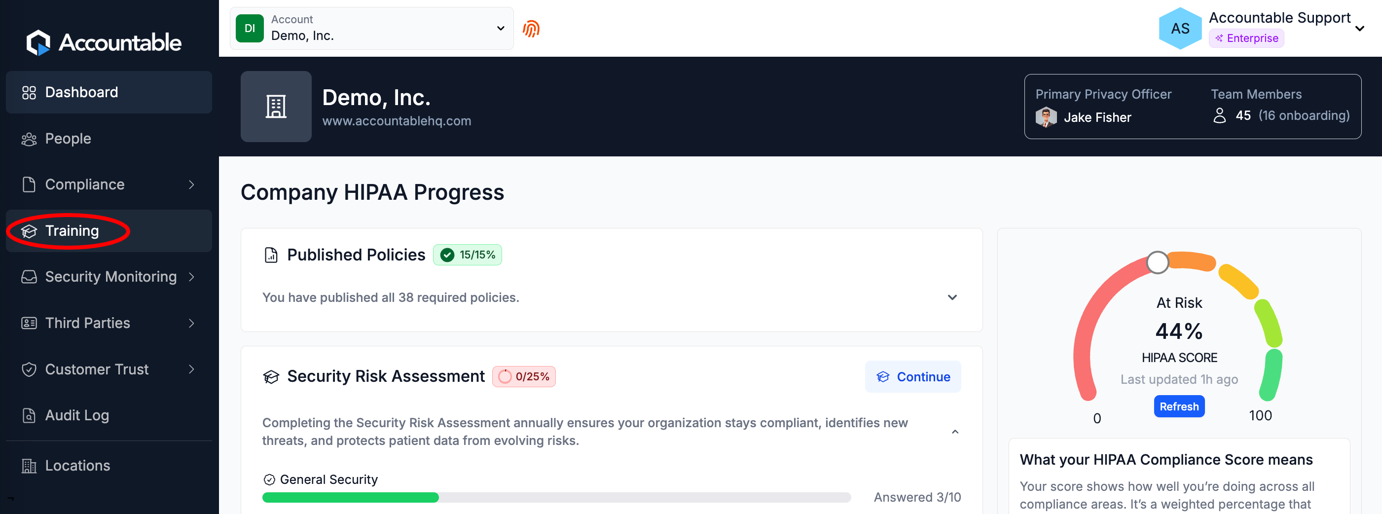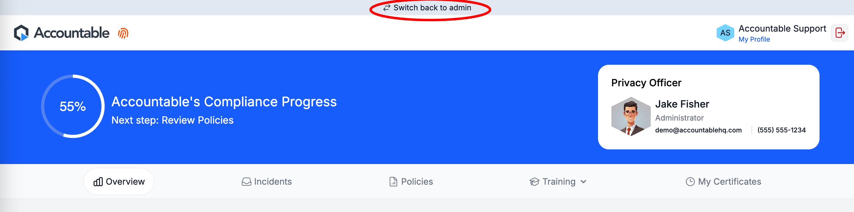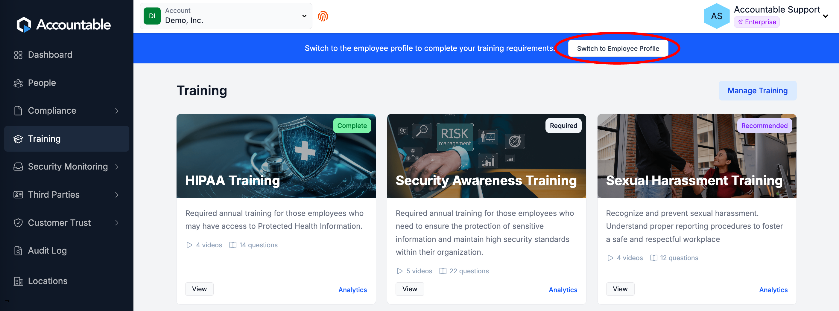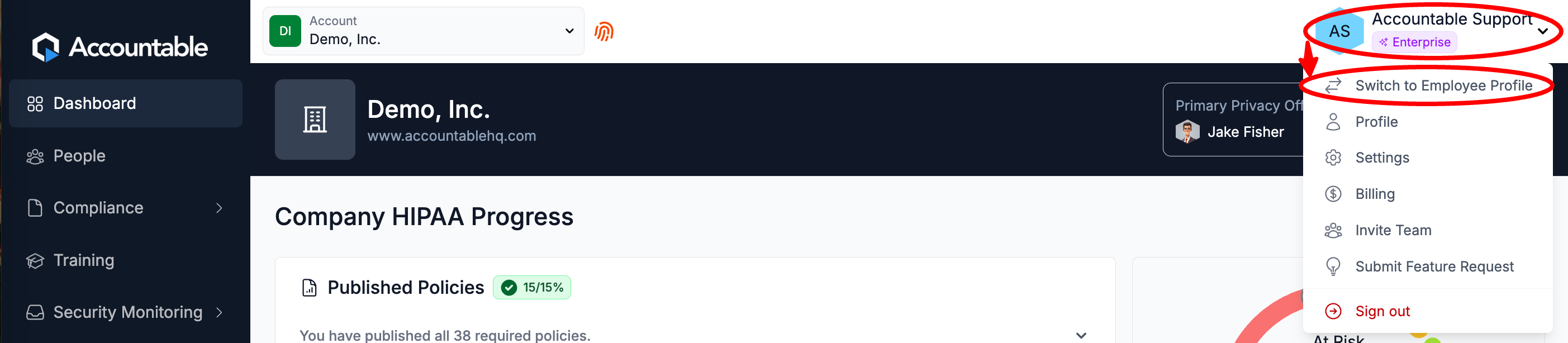 If you're an Admin or Privacy Officer, in order to meet your individual HIPAA requirements, you can switch to your Employee Dashboard through your Profile dropdown menu or the Training Tab.