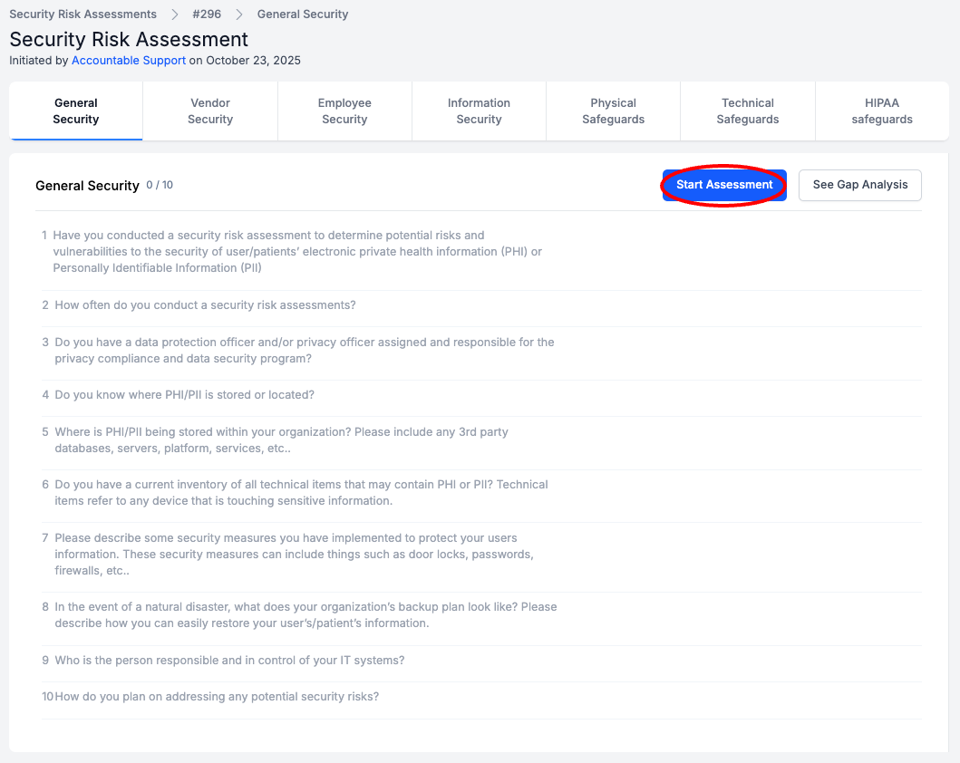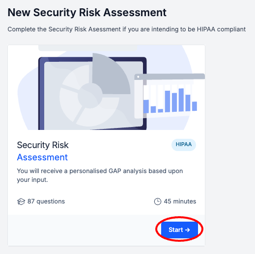The Security Risk Assessment documents the current state of your Organization's HIPAA Compliance setup. Your answers to the Assessment questions will be vastly different before and after going through the initial HIPAA Compliance Setup steps. Therefore, our suggestion is to start by going through your initial HIPAA Compliance setup before completing the Security Risk Assessment.