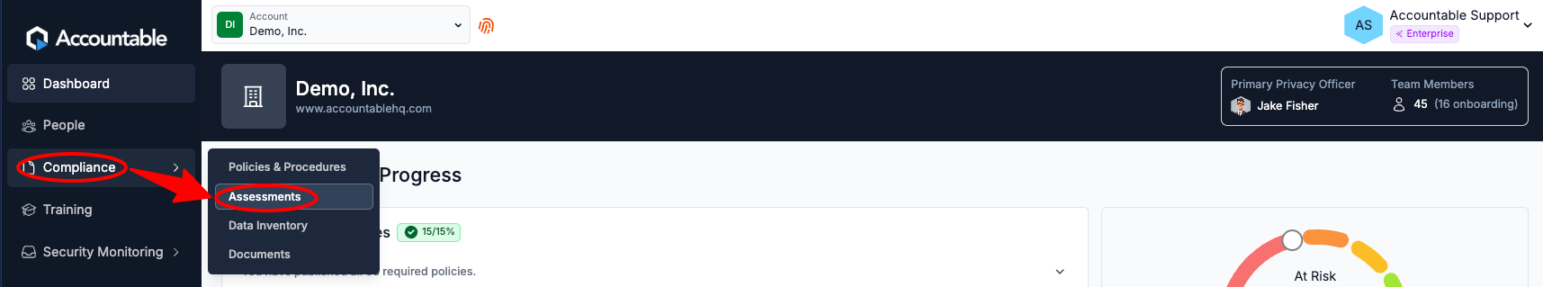 From the Dashboard, Select Compliance in the left sidebar > Select Assessments