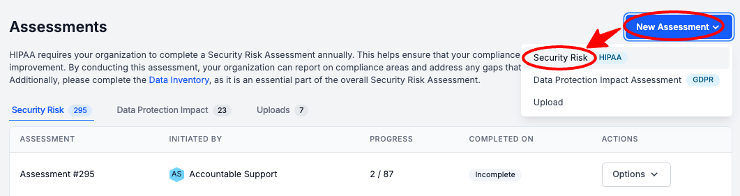 Select New Assessment > Select Security Risk
