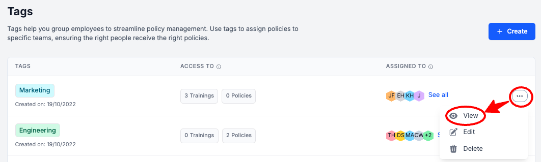 Tags help you save time in managing employee training and policy reviewing by allowing you to make changes to the one Smart Tag assigned to 100 users, instead of having to edit 100 users.