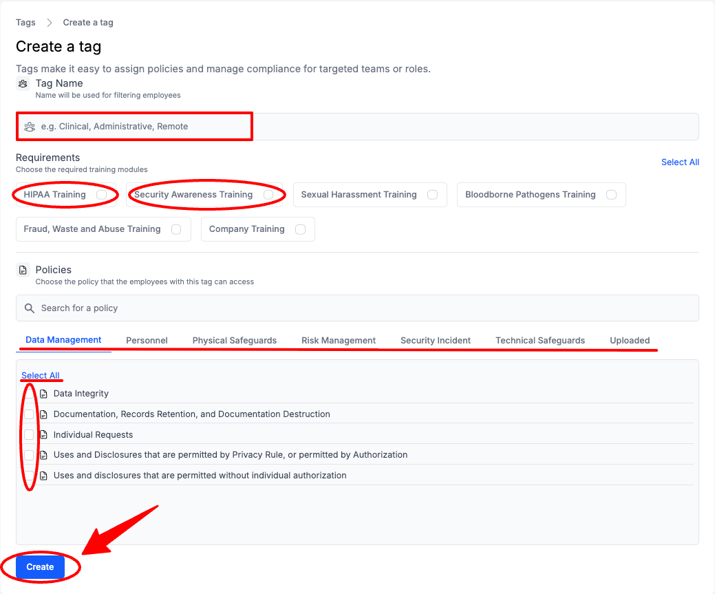 - Select the Required Trainings for this Tag Example: HIPAA Training and Security Awareness Training