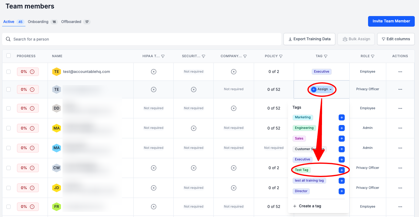 In the Team Members table, in the Tag column, Select Assign > Select a Tag