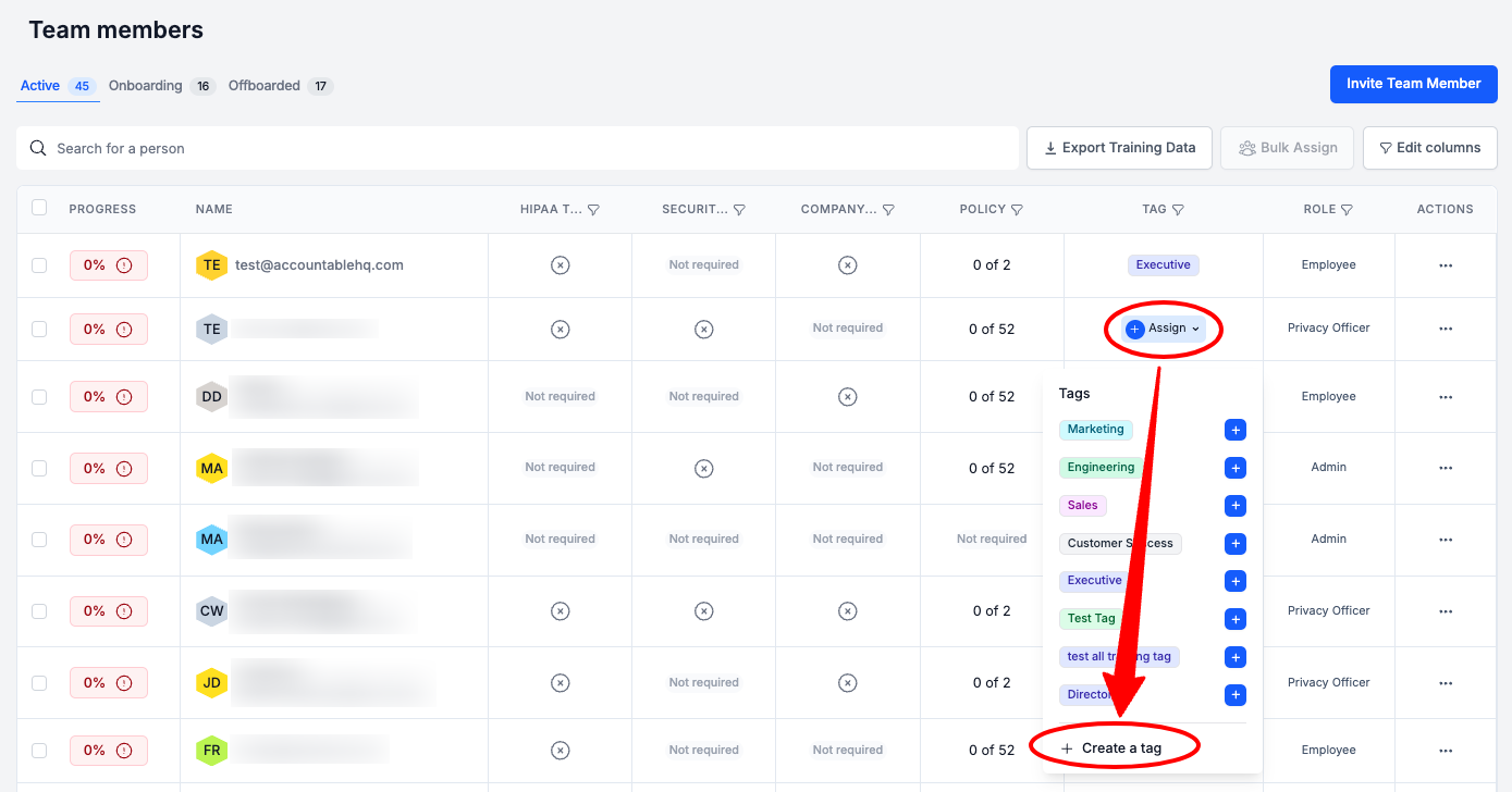In the Team Members table, in the Tag column, Select Assign > Select Create a Tag