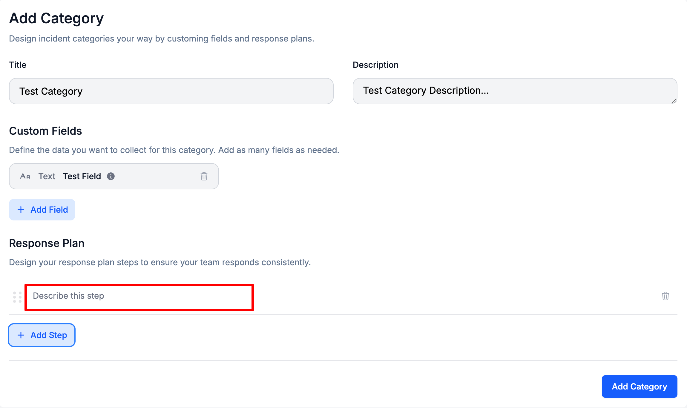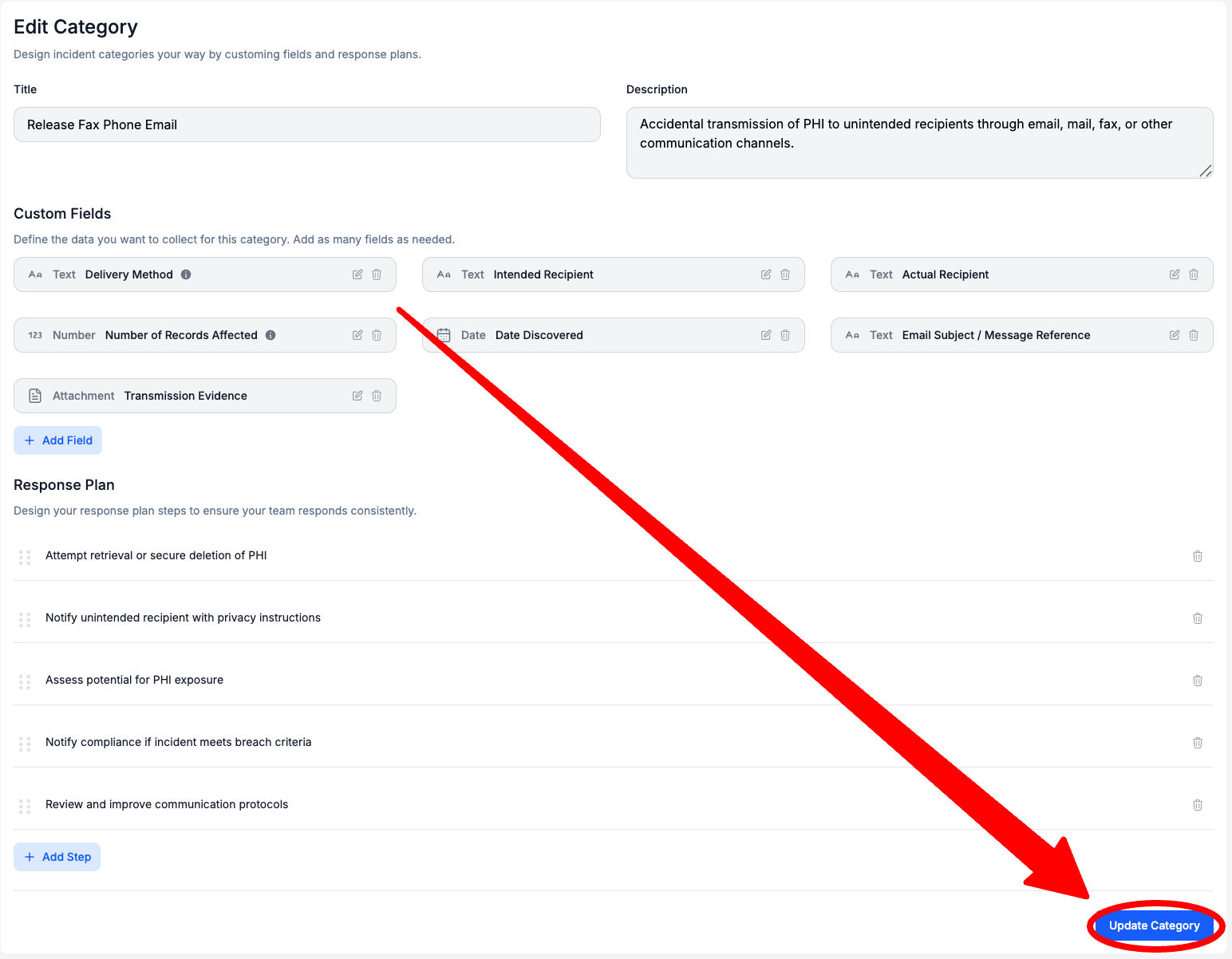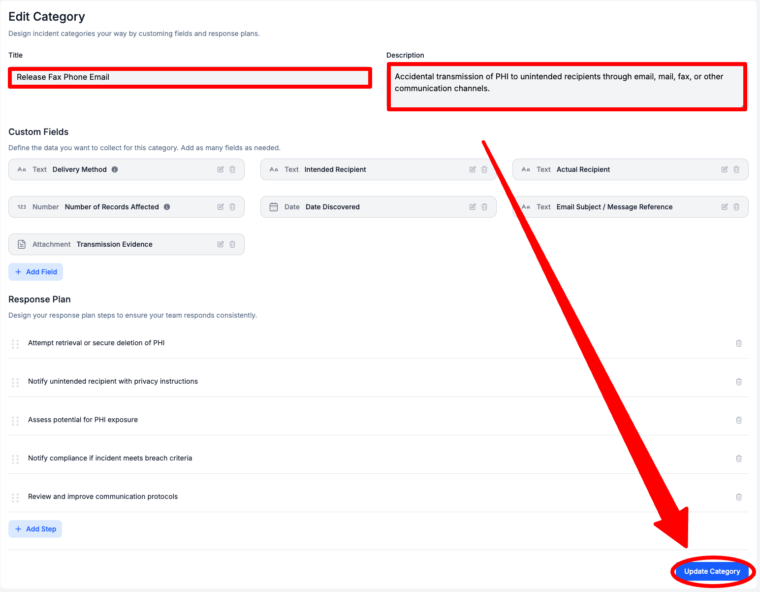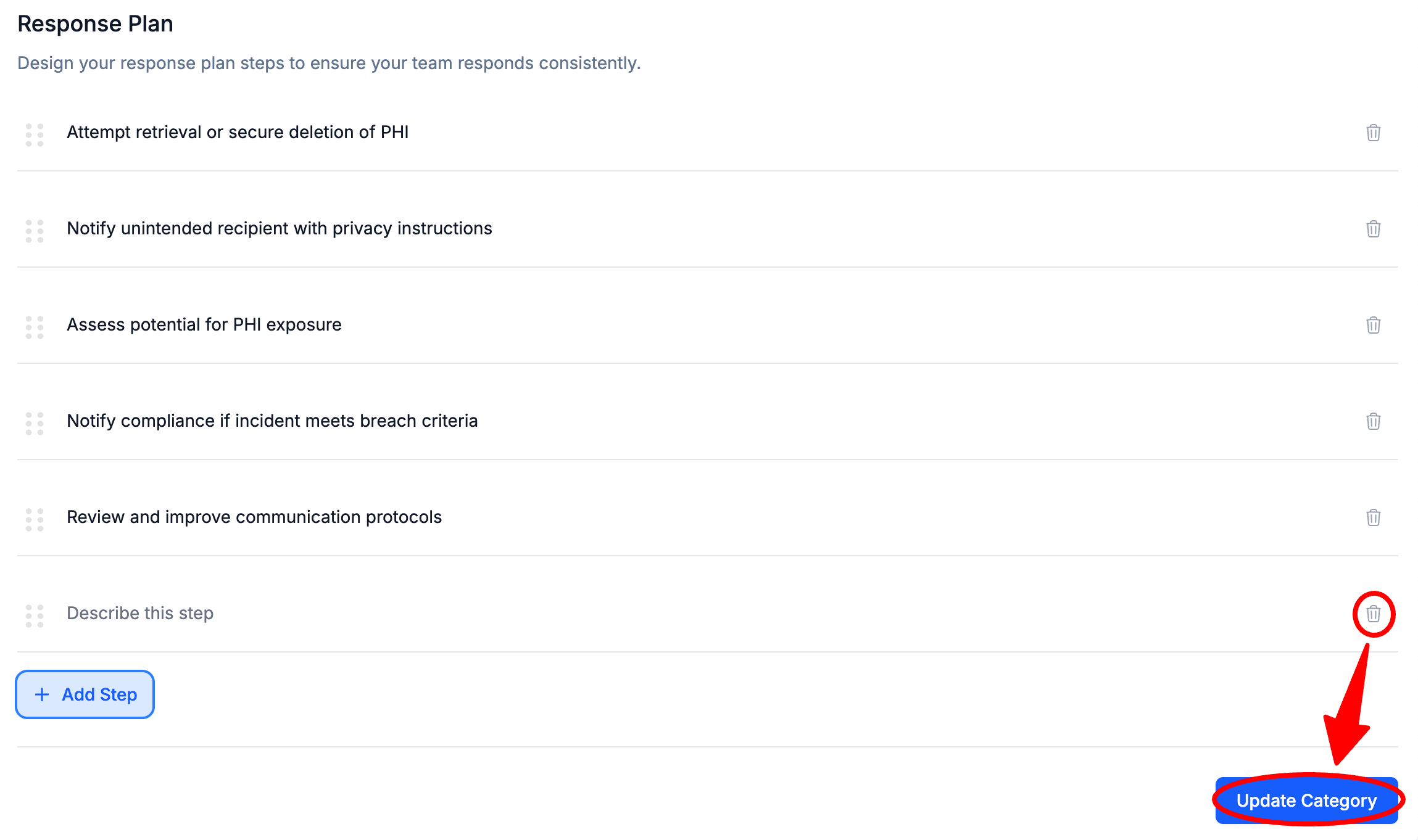 To the left of a Response Plan Step, Select the Trash Can Icon > Select Update Category