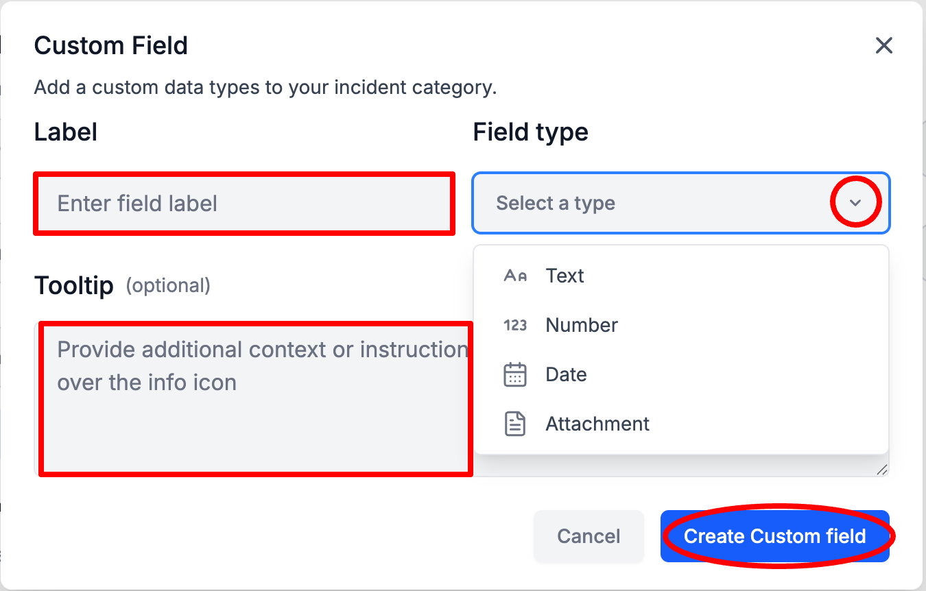 Enter the Custom Field Label and Field Type, and optionally Enter a Tooltip > Select Create Custom Field