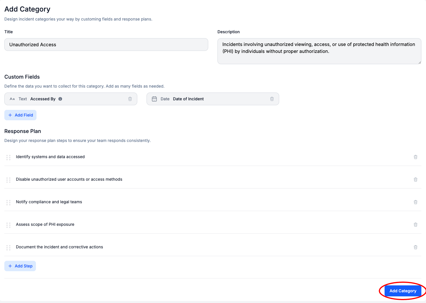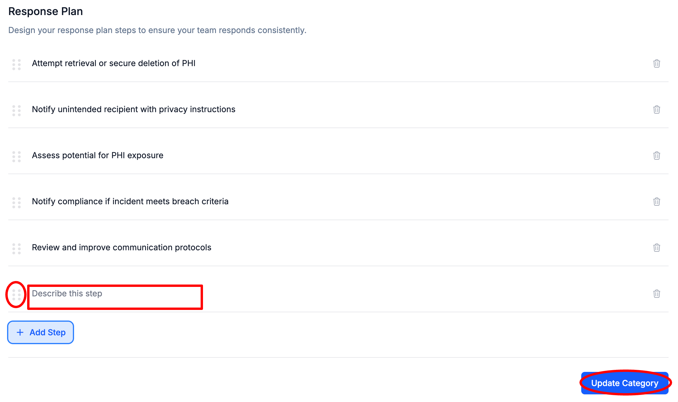 Click on the new Response Plan Step and Enter a Name for the Step and optionally Select the 6 dots to the left of a Response Plan Step and Drag to Reorder > Select Update Category
