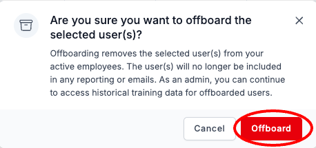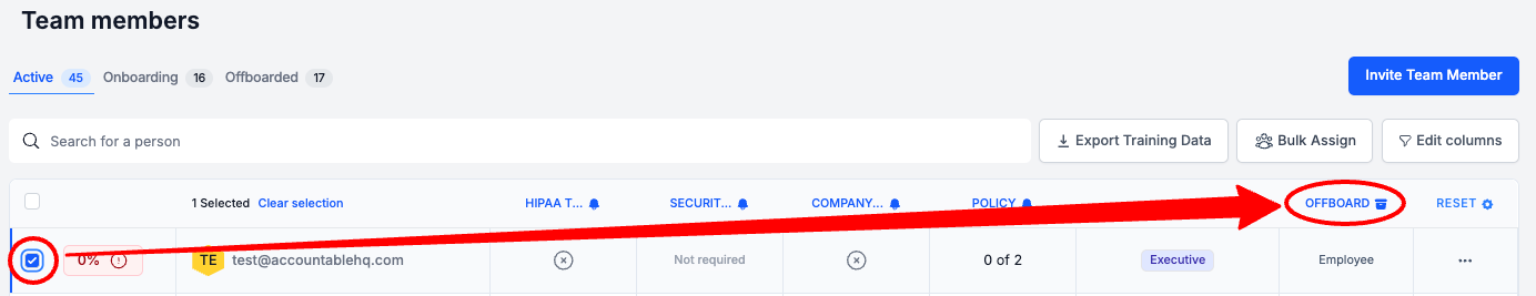 How to Offboard a UserSteps Offboard a User Offboard a User From the Dashboard, Select People in the left sidebar In the Team Members table, Select the checkbox next to a Team Member(s) > Select Offboard above the role column Select Offboard Updated about 1 month ago User ManagementHow to Reonboard a UserAsk AITable of Contents Offboard a User