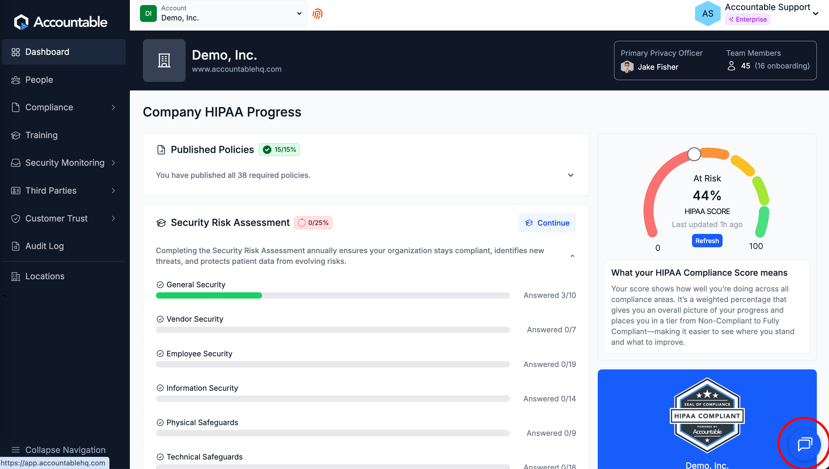 You can access support right from your Accountable platform! In all pages, in the bottom right corner, you'll find your very own Compliance Copilot!