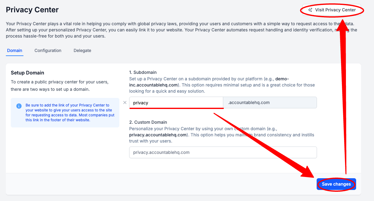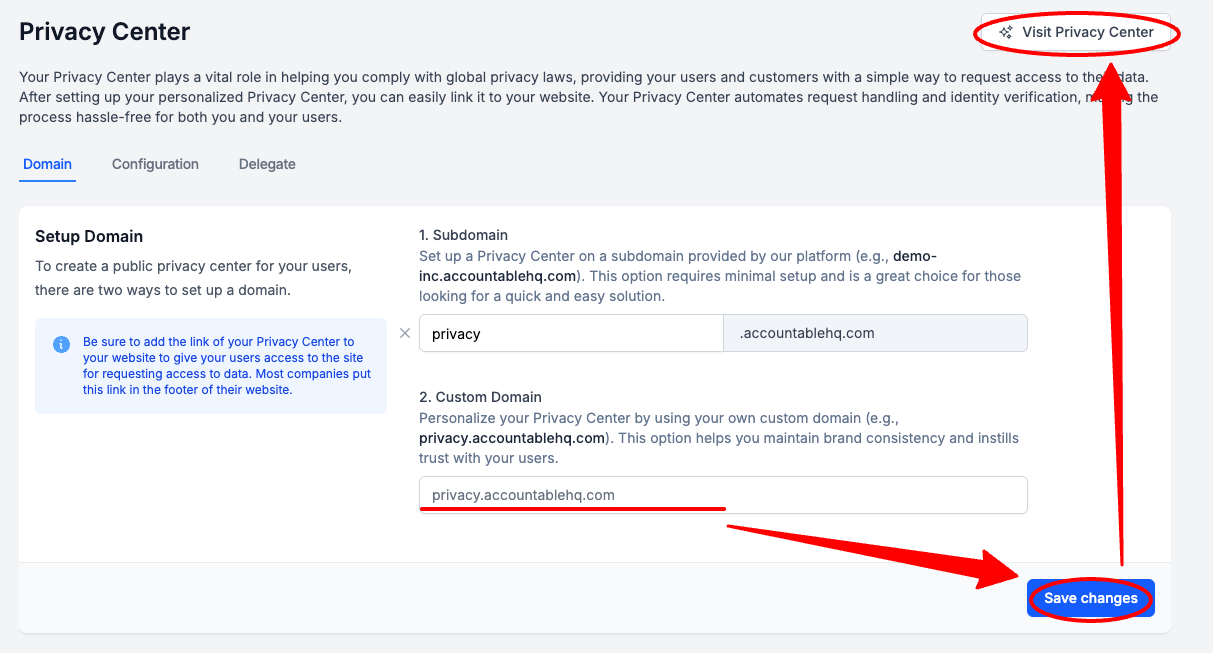 Enter a Custom Domain > Select Save Changes > optionally, Select Visit Privacy Center if you would like to see how your Privacy Center looks