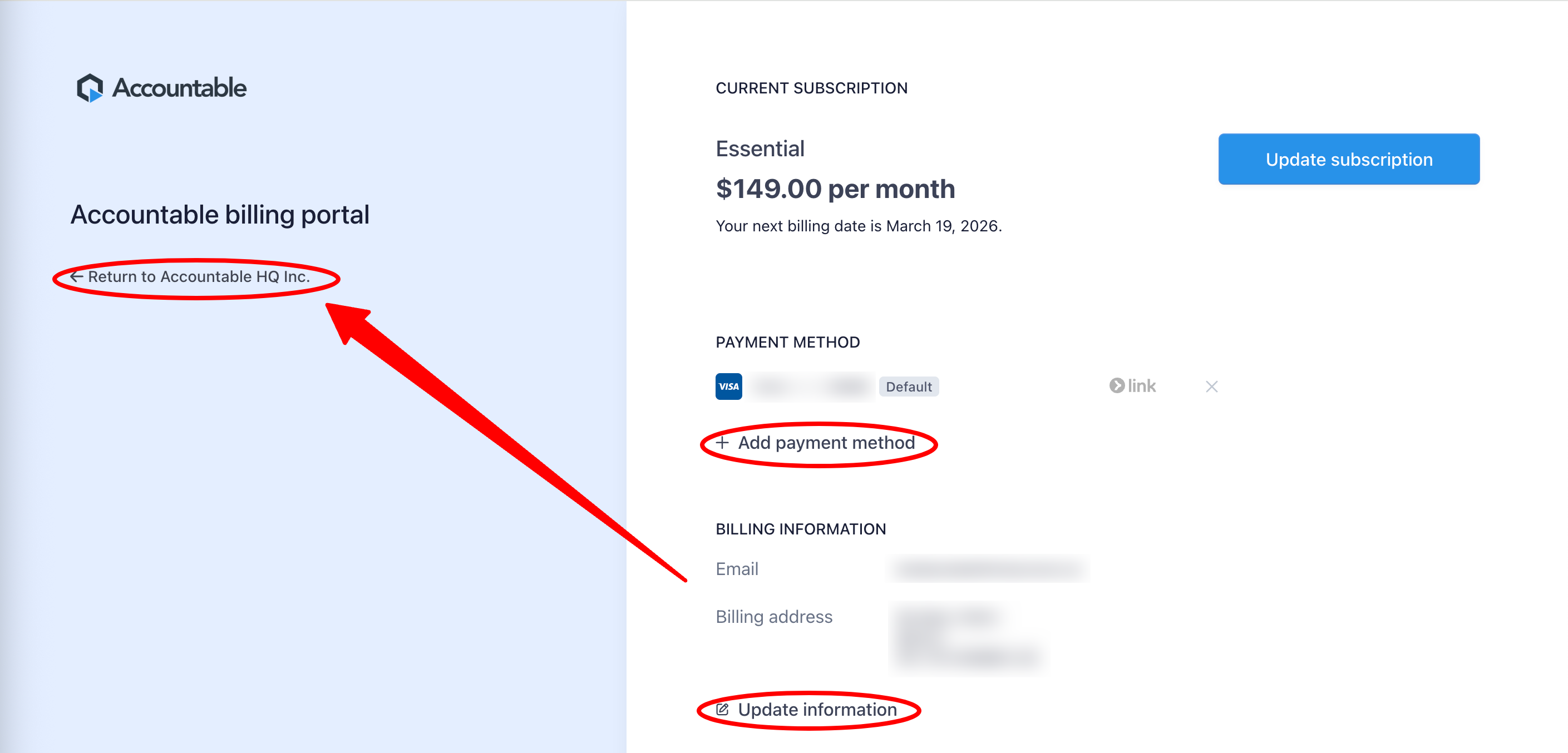 - Here you can Add a Payment Method and/or Update Billing Information: Email and Billing Address, then Return to Accountable