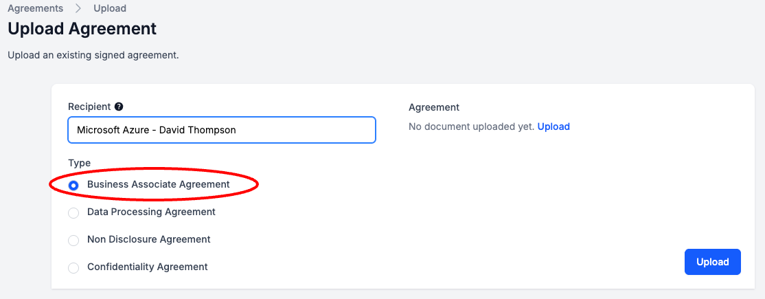 Select Upload > Upload your signed BAA > Select Upload