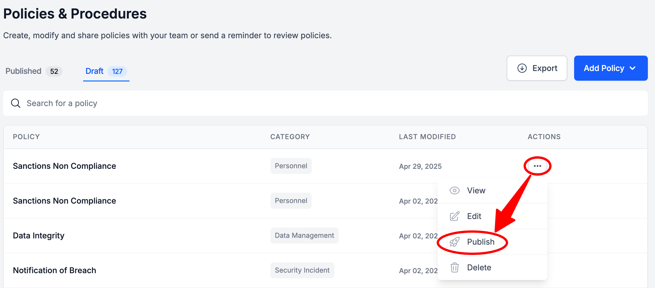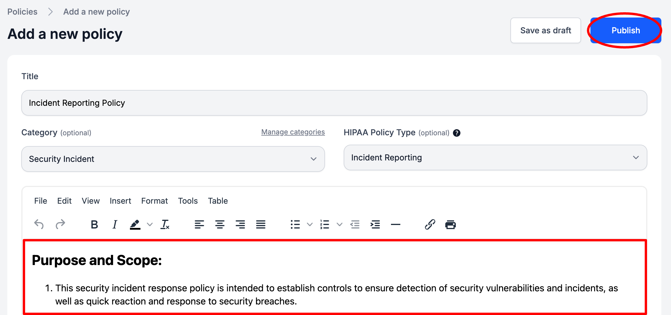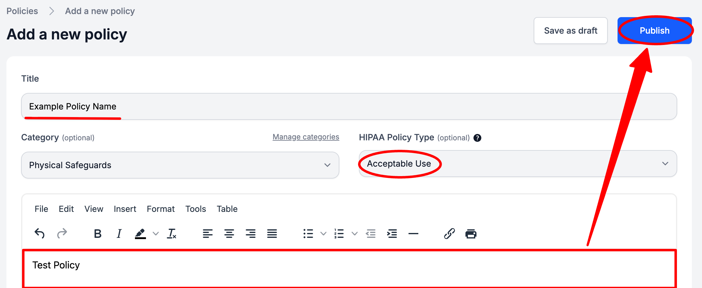 Enter Policy or Procedure Info > Select Save as Draft or Select Publish
