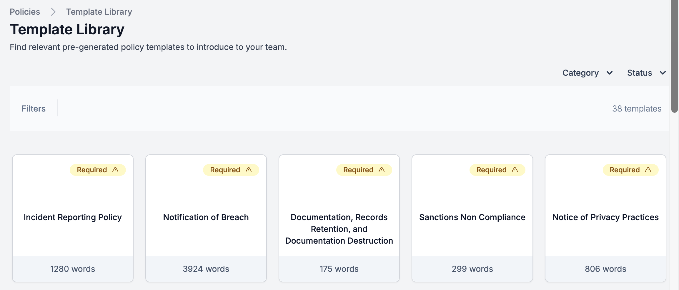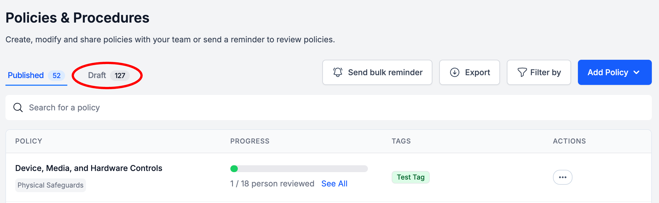 - Status: Filter by if there is no active Policy or Procedure under the HIPAA Compliance Type, if there is one actively in Draft, or if there is one already Published