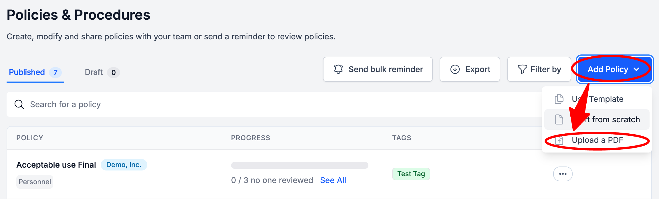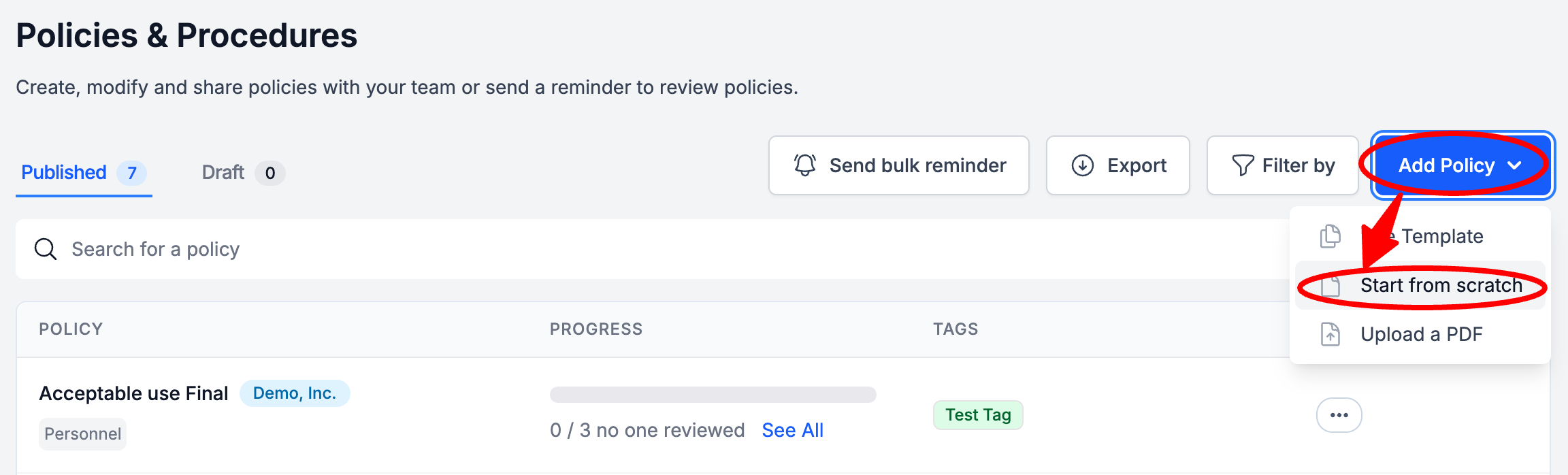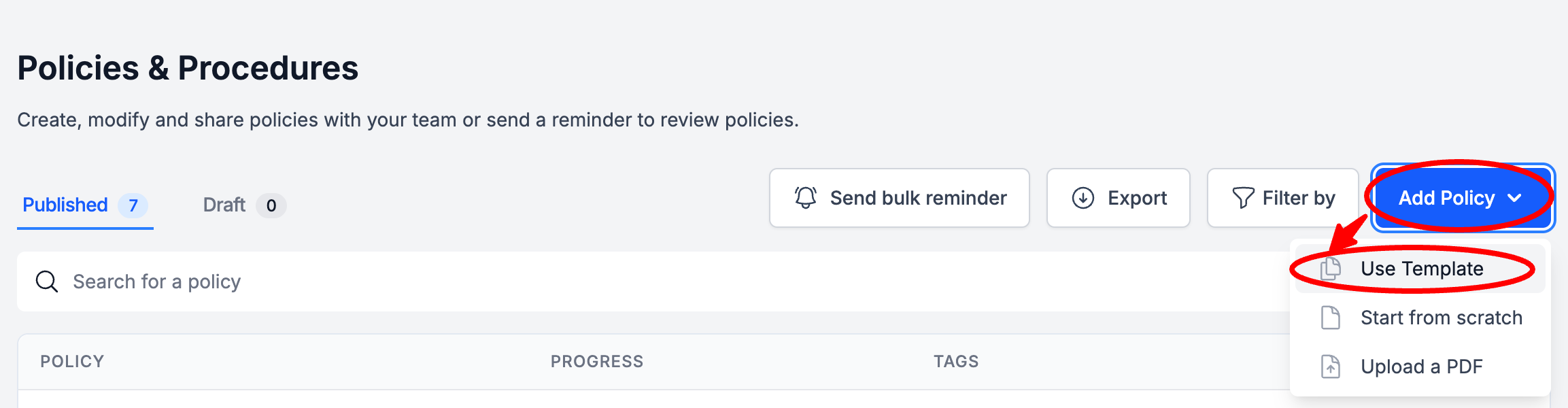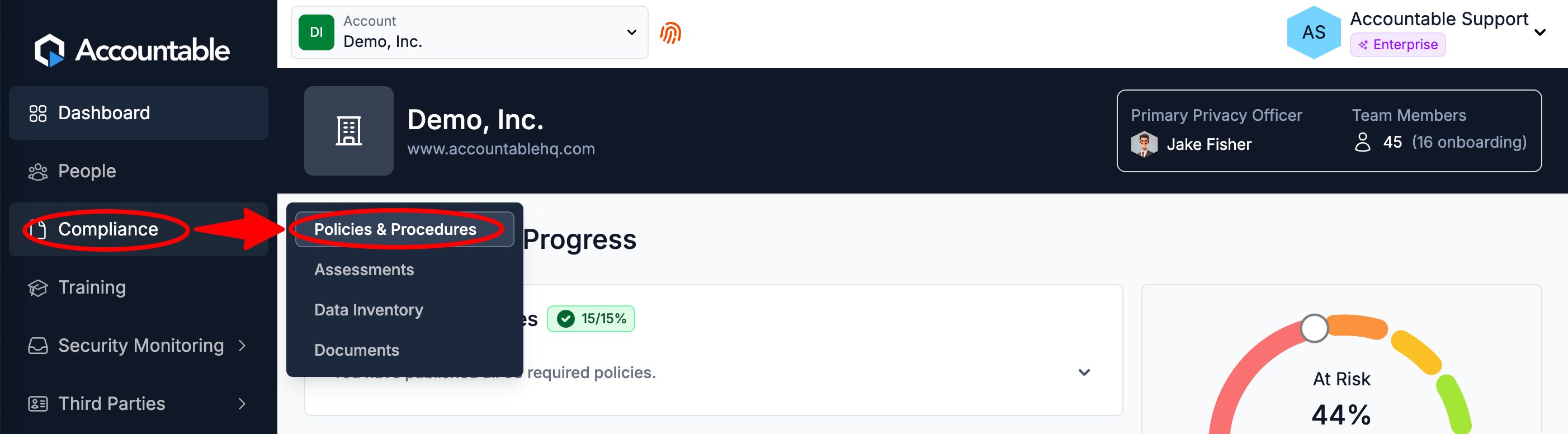 From the Dashboard, hover over the Compliance section > Select Policies & Procedures