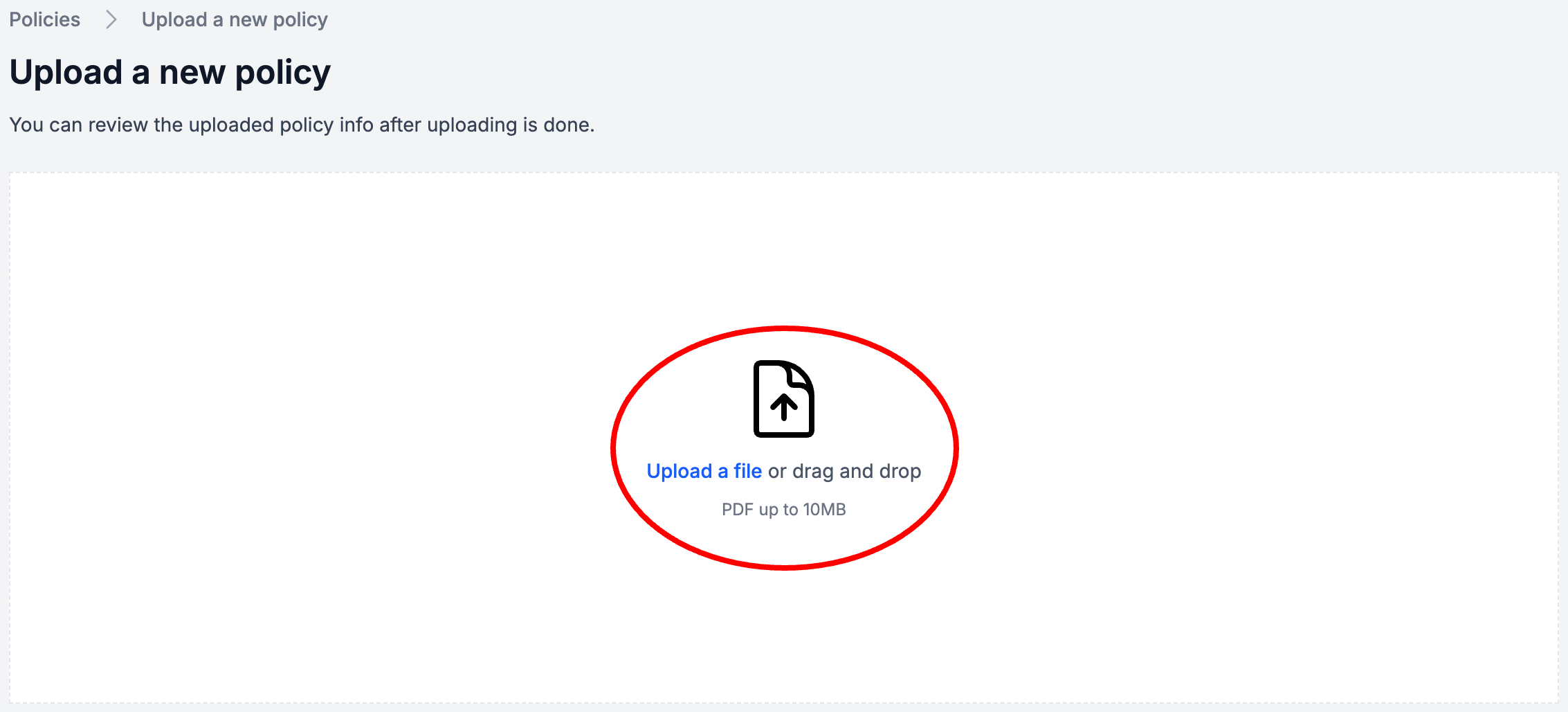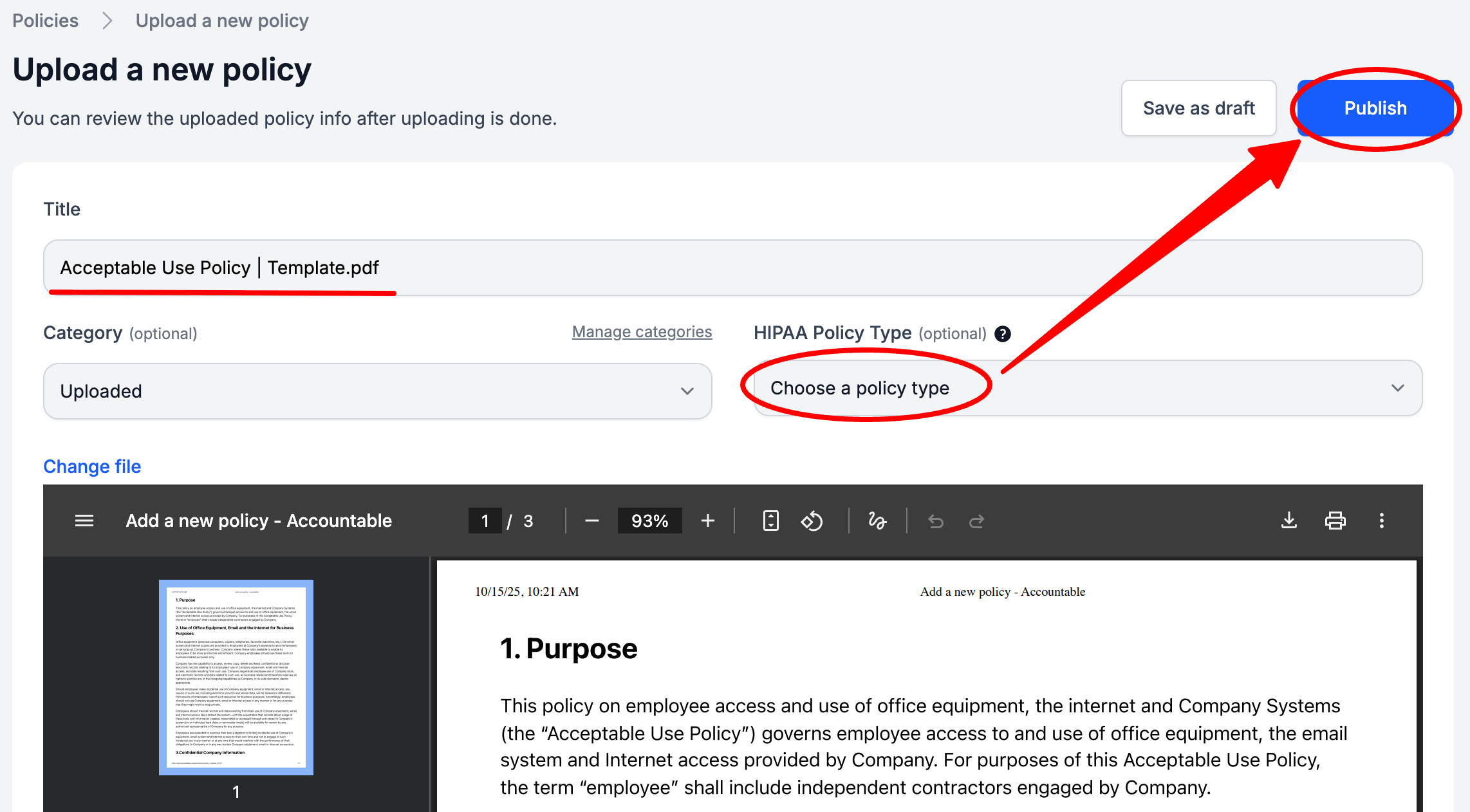 Once uploaded, **Enter Policy or Procedure info **> Select Save as Draft or Select Publish